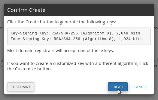 • After that, click the Create button again. If we need custom settings, we can click the Customize button. The default settings will work with most registrars.