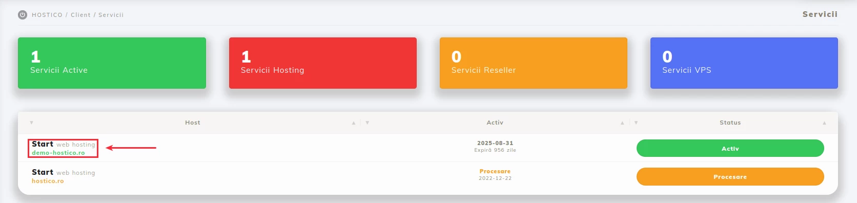 - After logging into the Hostico client account, go to the Services; section