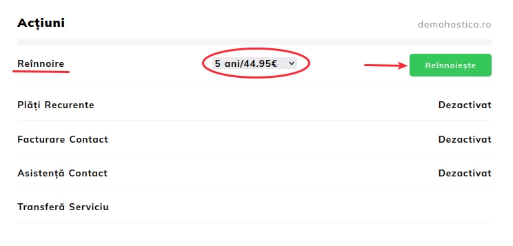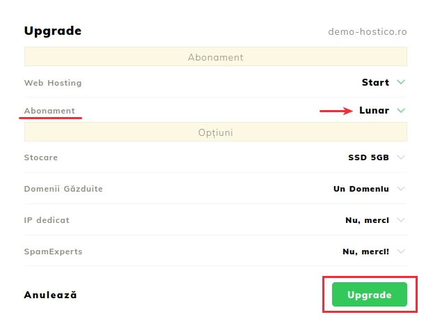 In the newly opened panel, we will access the UPGRADE menu;- The Subscription section allows updating the billing period of the hosting package;
