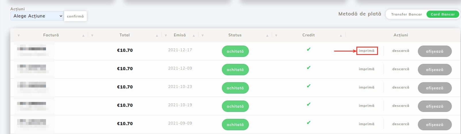 Next to the invoice you wish to download in RON, click on Print;