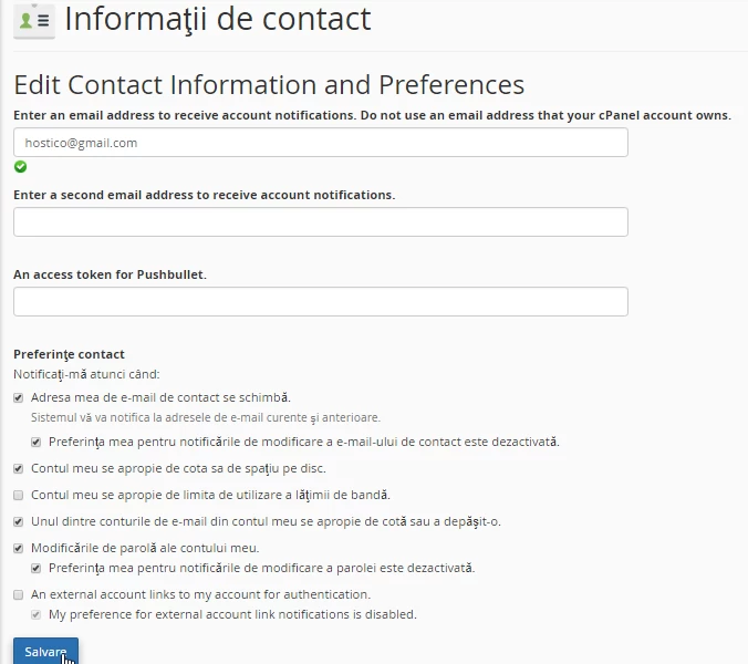 - In our case we will add the contact address hostico@gmail.com and we will check the following notifications: