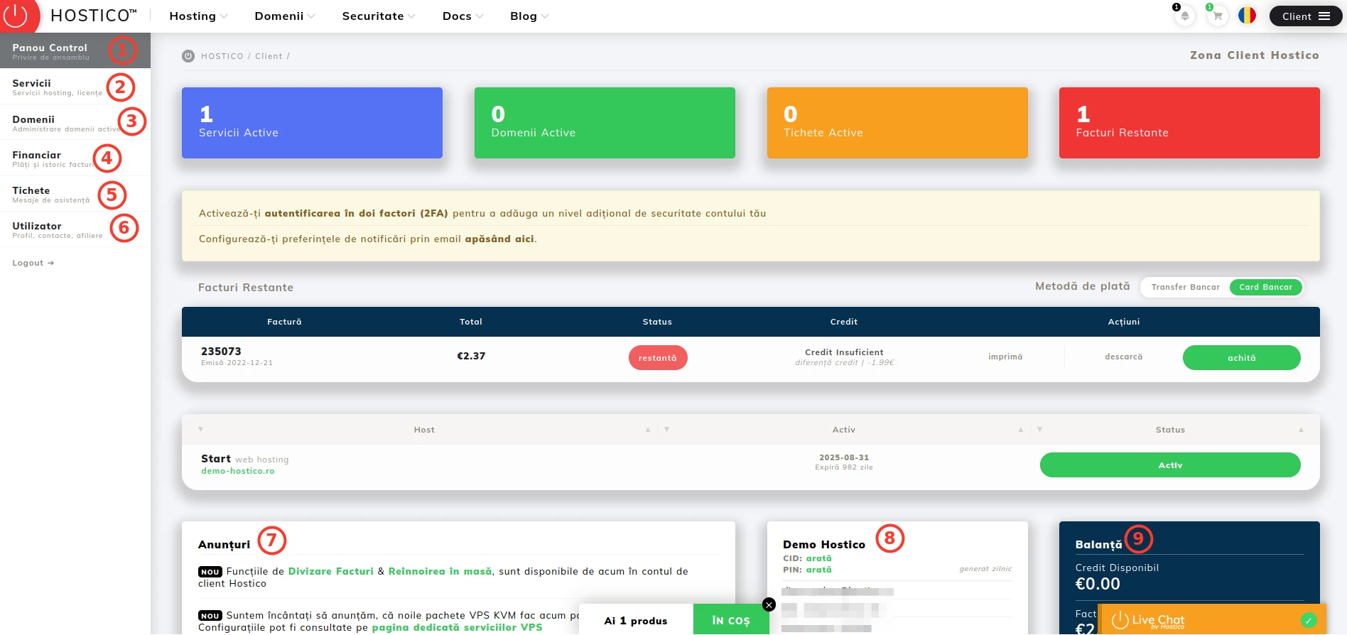- (8) Hostico Demo - displays unique information from the client account such as the ID or PIN code;