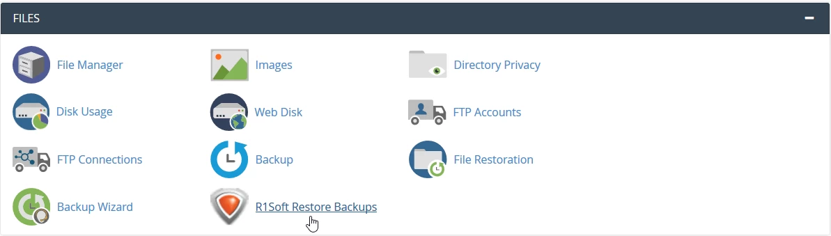 - Once the control panel is accessed, we will go to the Files section and click on R1soft Restore Backups.