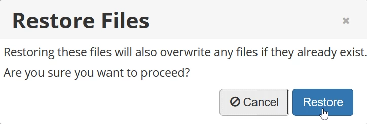 - We will be greeted with a warning message, informing us that the existing files in the selected folder will be replaced with those from the backup. If we want to keep a copy of the current files, we can rename the folder using File Manager or an FTP client, so that the contents of the folder are not replaced with the files from the backup (for example renaming public_html to public_html_old).