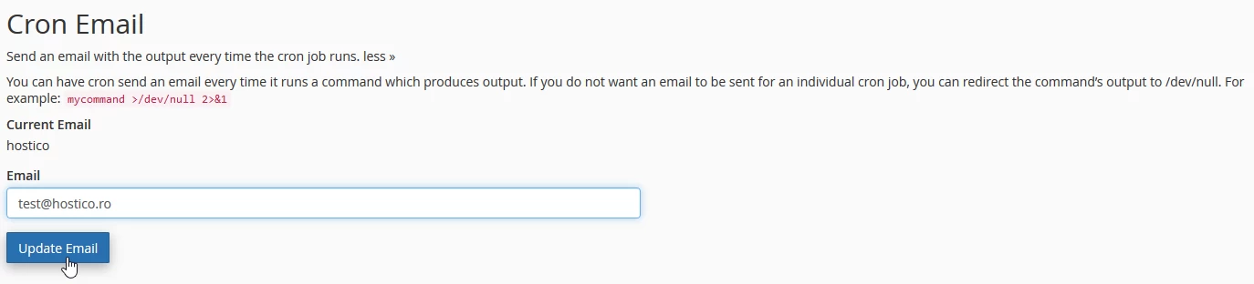 - On the next page, you will be able to set the email address to which the cron job results should be sent, if desired, after which you press the Update Email button