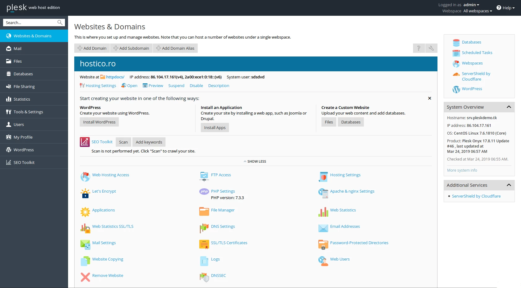 Although it is a simplified interface, it provides access to most settings necessary for customizing services according to the needs of the respective websites and applications, such as: email settings, modifying PHP directives, editing the DNS zone, automatic installation of the most common applications, etc.